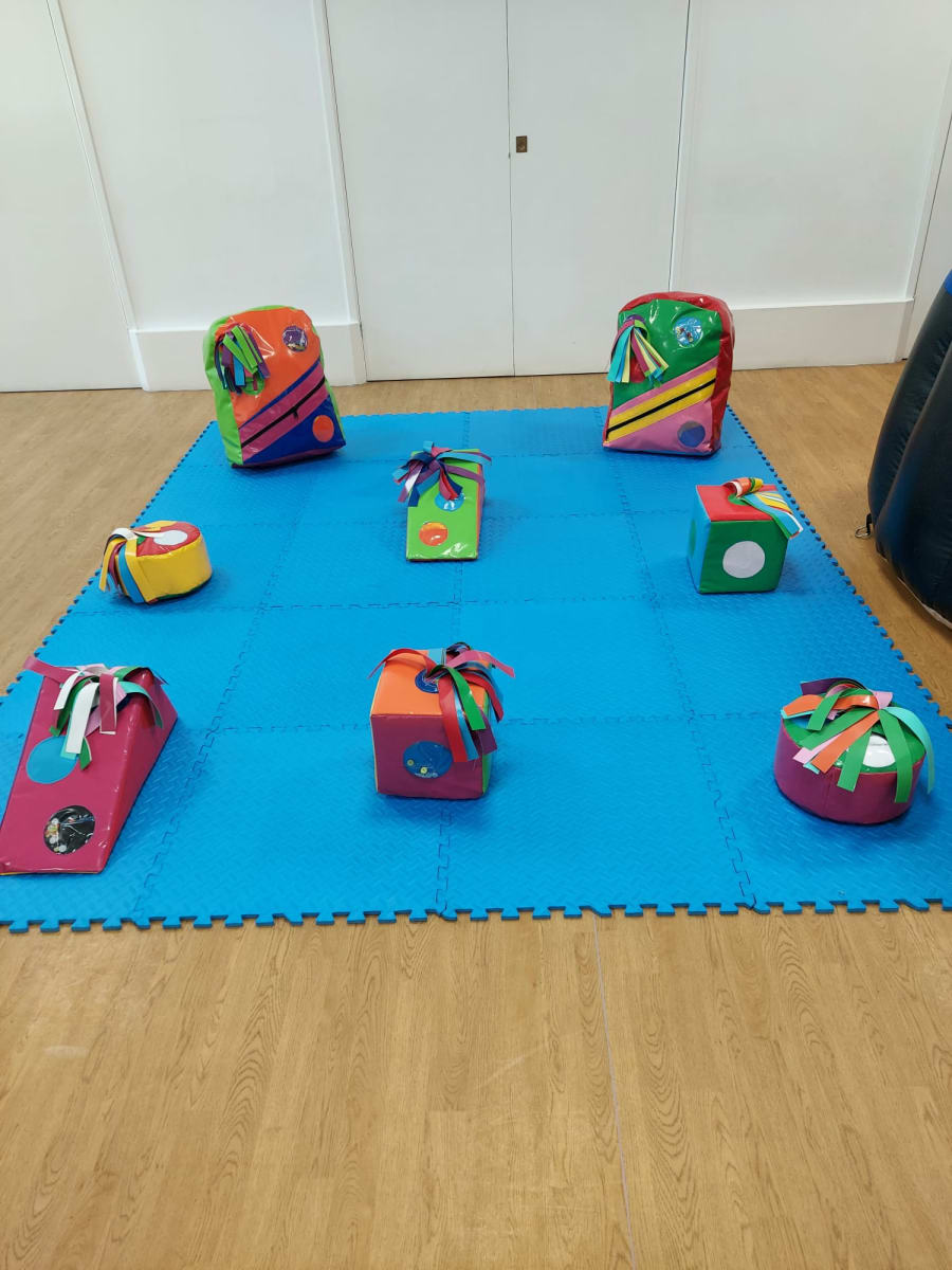 Made of soft foam covered in bright, colourful wipe clean surfaces these shapes have a multitude of tactile surfaces to explore. zips, squeaker, mesh, buttons, bells. Our soft play is set up on safety matting too.