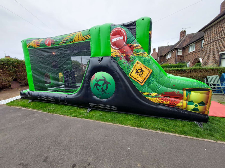 Make your child's day with this modern obstacle section. The inflatable obstacle course offers a safe entrance way with full theming, followed by a series of biff and bash pillars, cool chill out area in the middle, steep ladder climb and a crazy slide out of the end. The obstacle course is the perfect choice for your little one's birthday party school gala, summer fete and works fantastically as a stand alone item or as part of a larger package of matching inflatables.