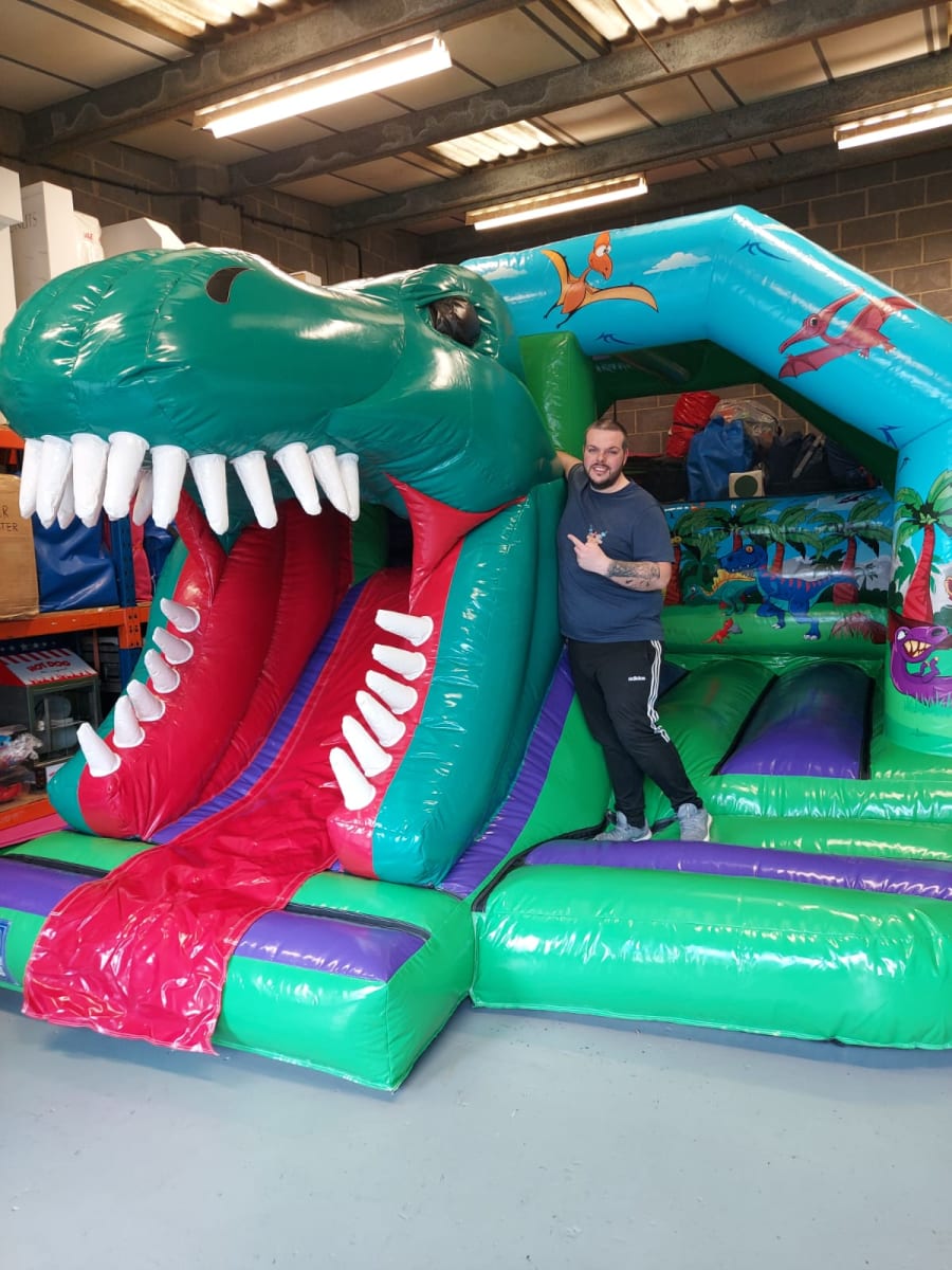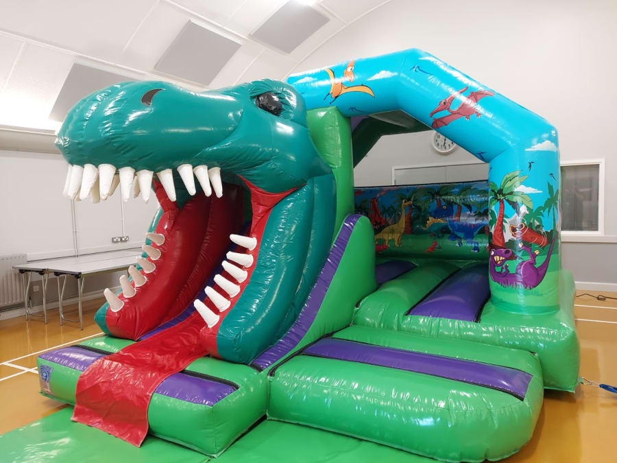 Our Dinosaur Bouncy Castle with Front Slide is bright and colourful with artwork standing out with lots of dino friends. But this isn't the main feature, the huge 3D Dinosaur head with slide coming through his mouth is so eye catching. His roarsome name is Dex the T-Rex and he wants to come to your party. These castles are the newest and best designs available on the market, add the best wow factor to any party or event.