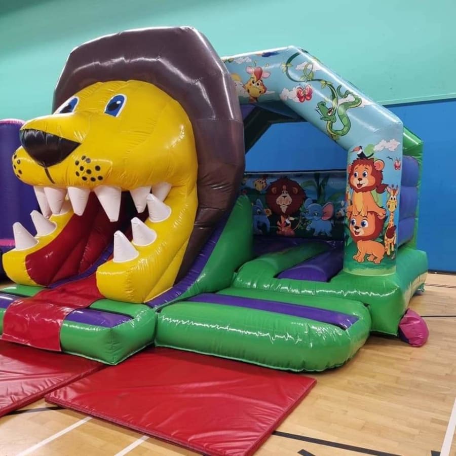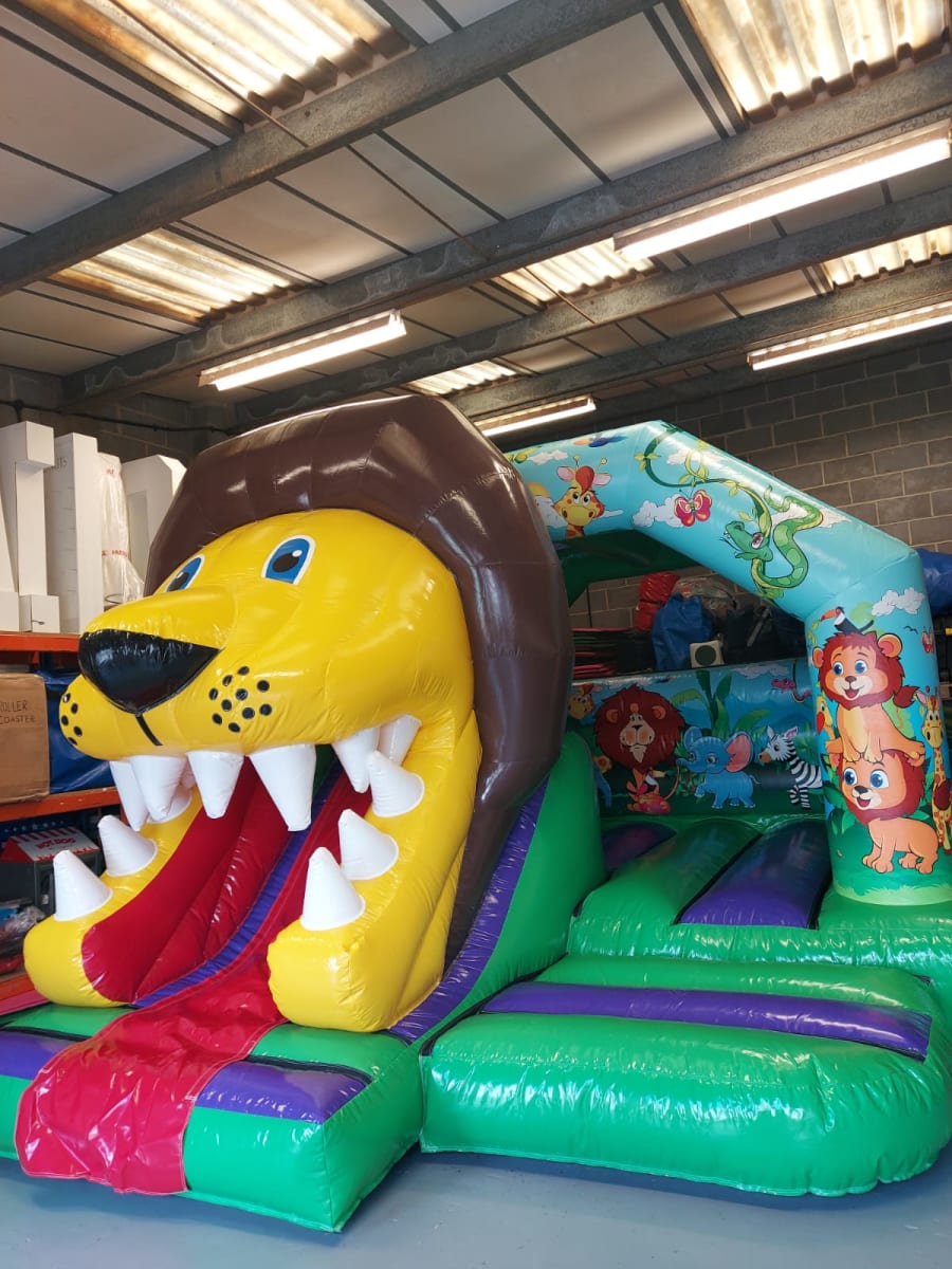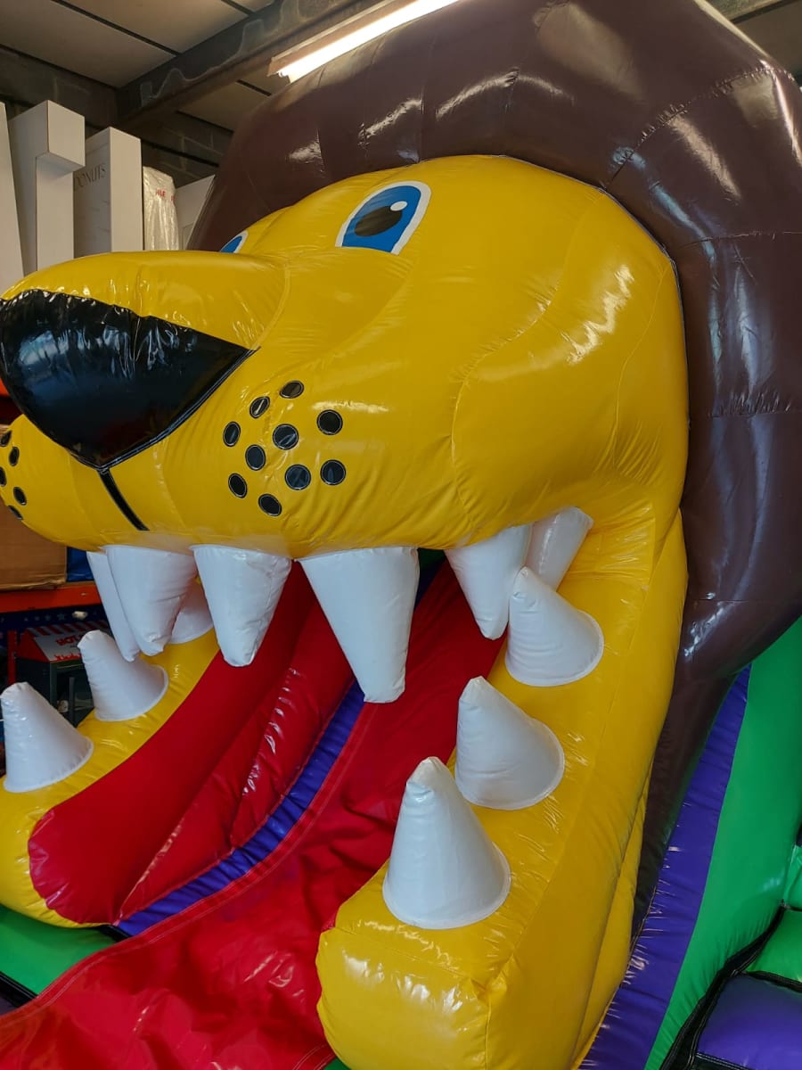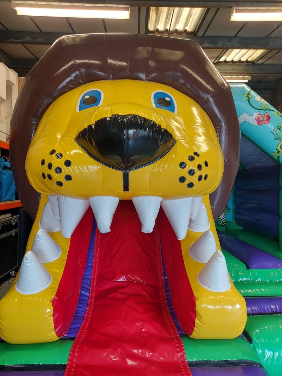 Our Jungle Bouncy Castle with Front Slide is bright and colourful with artwork standing out with lots of jungle friends. But this isn't the main feature, the huge 3D lion head with slide coming through his mouth is so eye catching. His roarsome name is Leo the lion and he wants to come to your party. These castles are the newest and best designs available on the market and add the best wow factor to any party or event.