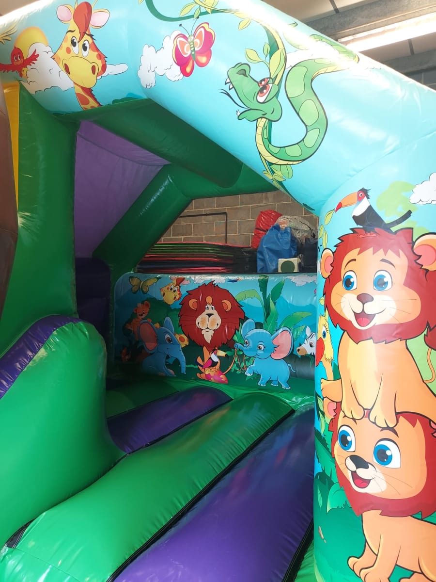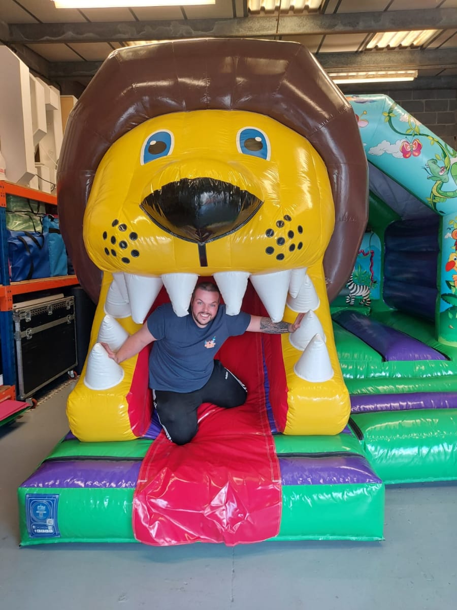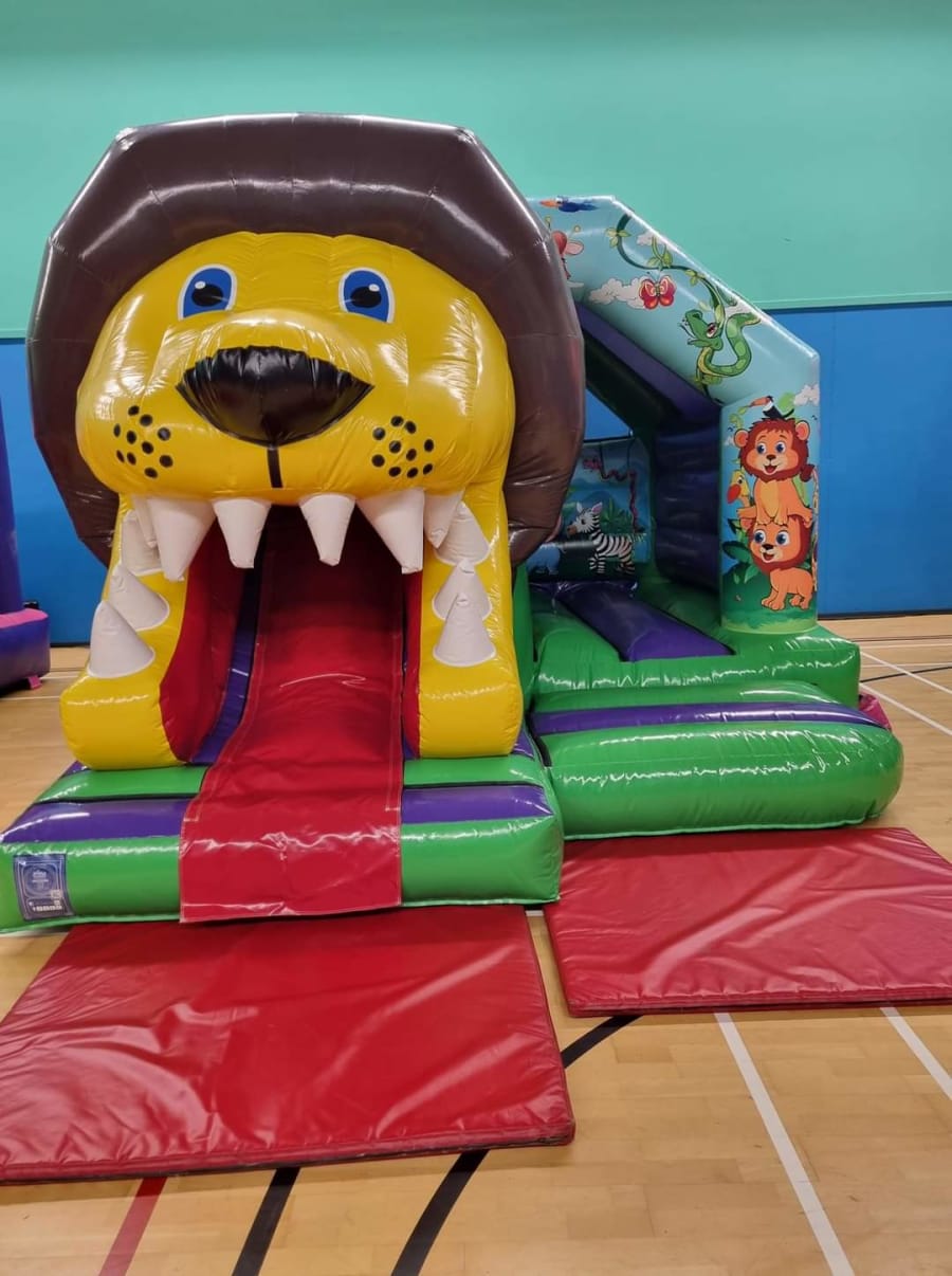 Our Jungle Bouncy Castle with Front Slide is bright and colourful with artwork standing out with lots of jungle friends. But this isn't the main feature, the huge 3D lion head with slide coming through his mouth is so eye catching. His roarsome name is Leo the lion and he wants to come to your party. These castles are the newest and best designs available on the market and add the best wow factor to any party or event.