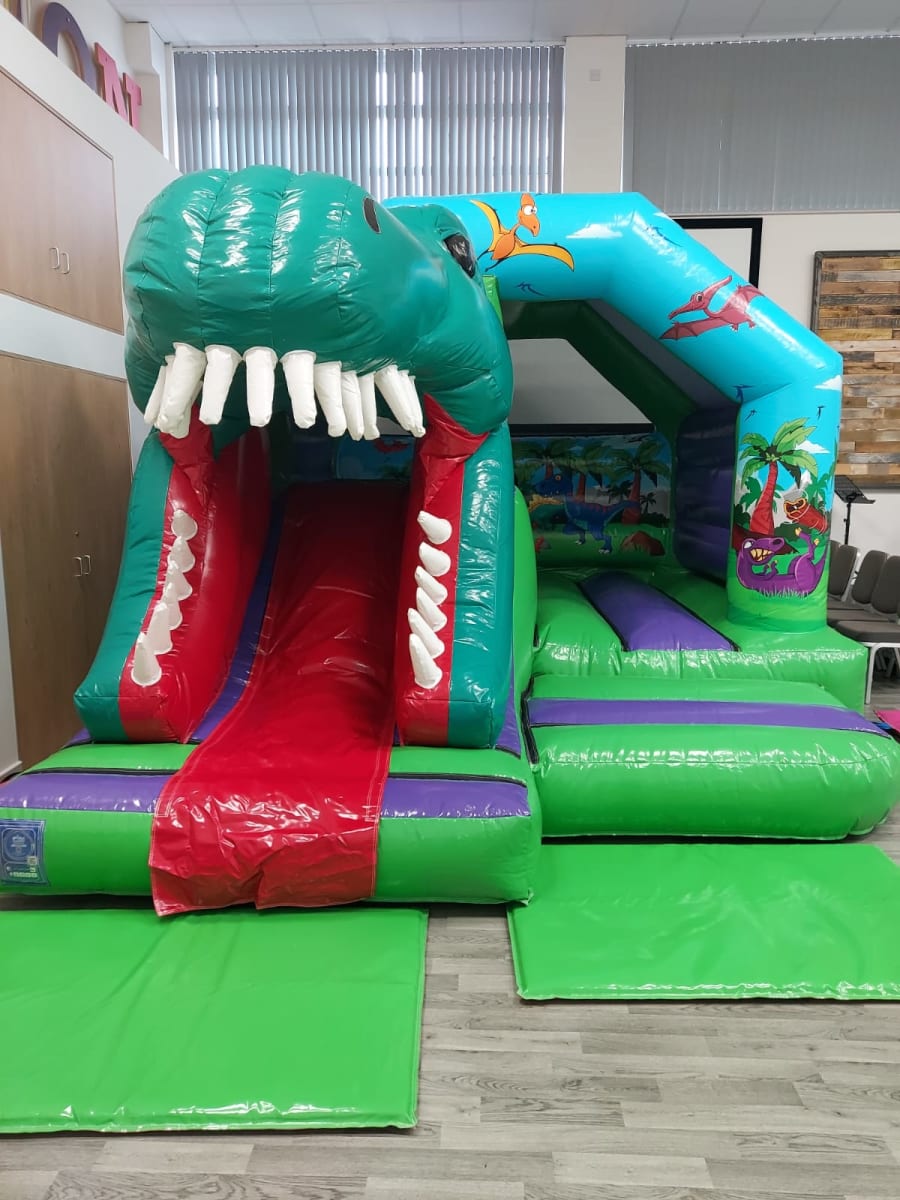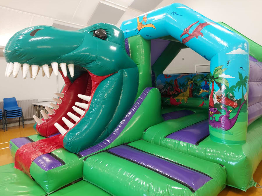 Our Dinosaur Bouncy Castle with Front Slide is bright and colourful with artwork standing out with lots of dino friends. But this isn't the main feature, the huge 3D Dinosaur head with slide coming through his mouth is so eye catching. His roarsome name is Dex the T-Rex and he wants to come to your party. These castles are the newest and best designs available on the market, add the best wow factor to any party or event.