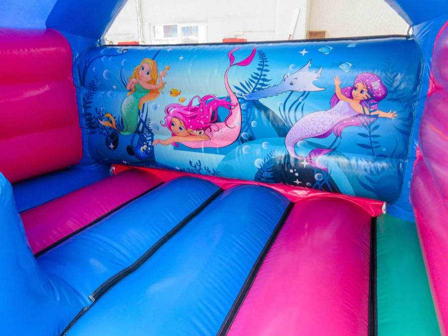 We chose to have this castle a mixture of pink and blue to represent the under-the-sea aspect of the theme. We also decided to go a little further all out on this design, having the theme printed all over the front of the bouncy castle as well as the back wall, creating that immersive feeling.