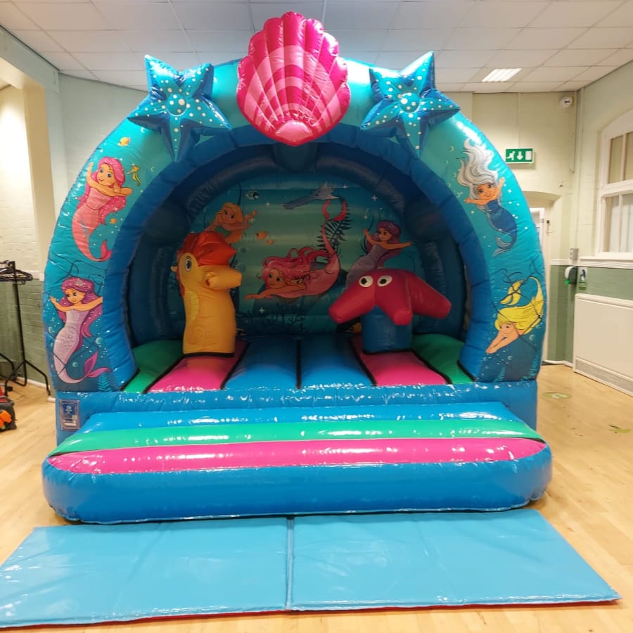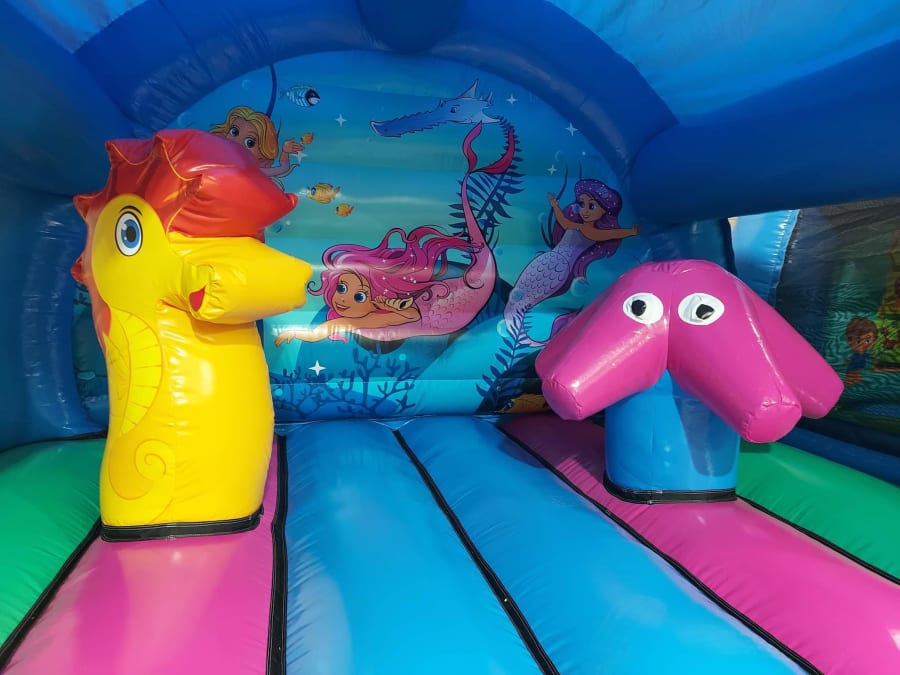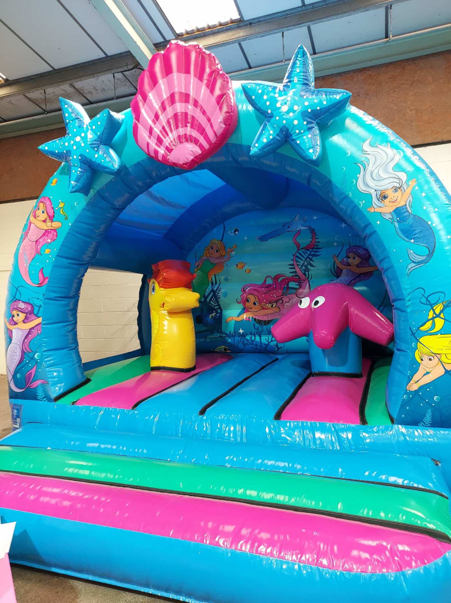 This is a Beautiful Mermaid Bouncy Castle, This is a sensational theme and we are pretty sure this Bouncy Castle is going to be a massive hit with the little girls parties and mermaid lovers. Its covered in stunning Mermaids and sea creatures the colours are a perfect match to the theme. `The 3D characters really make this castle stand out from the crowd with the beautiful seahorse and pink starfish. The sides are netted and are great to keep an eye on the little ones. This castle Is great for all events indoors and outdoors.