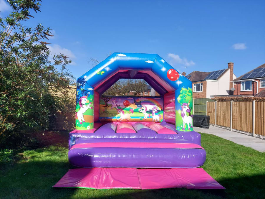 Wow! Take a look at our unicorn bouncy castle. Who doesn't love unicorns? A beautiful centre piece to a birthday party, christening or wedding. This castle goes great with our unicorn soft play take a look Unicorn Package. Our castle can go indoors and ourtdoors, has a shower cover fitted.