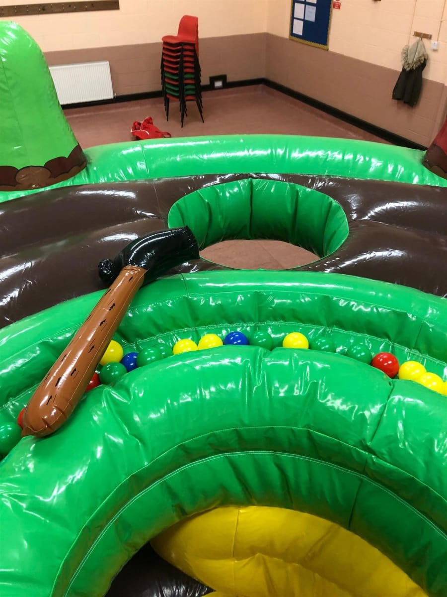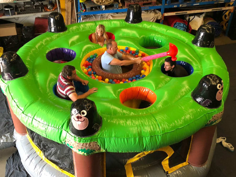 Whack-A-Mole Human Inflatable 15ft x 15ft This is our BRAND NEW Human Whack -A-Mole inflatable game. A seven player high adrenalin game where speed, skill and quick reflexes will make you the winner by collecting all the balls as one player attempts to 'whack' the other six 'moles'.