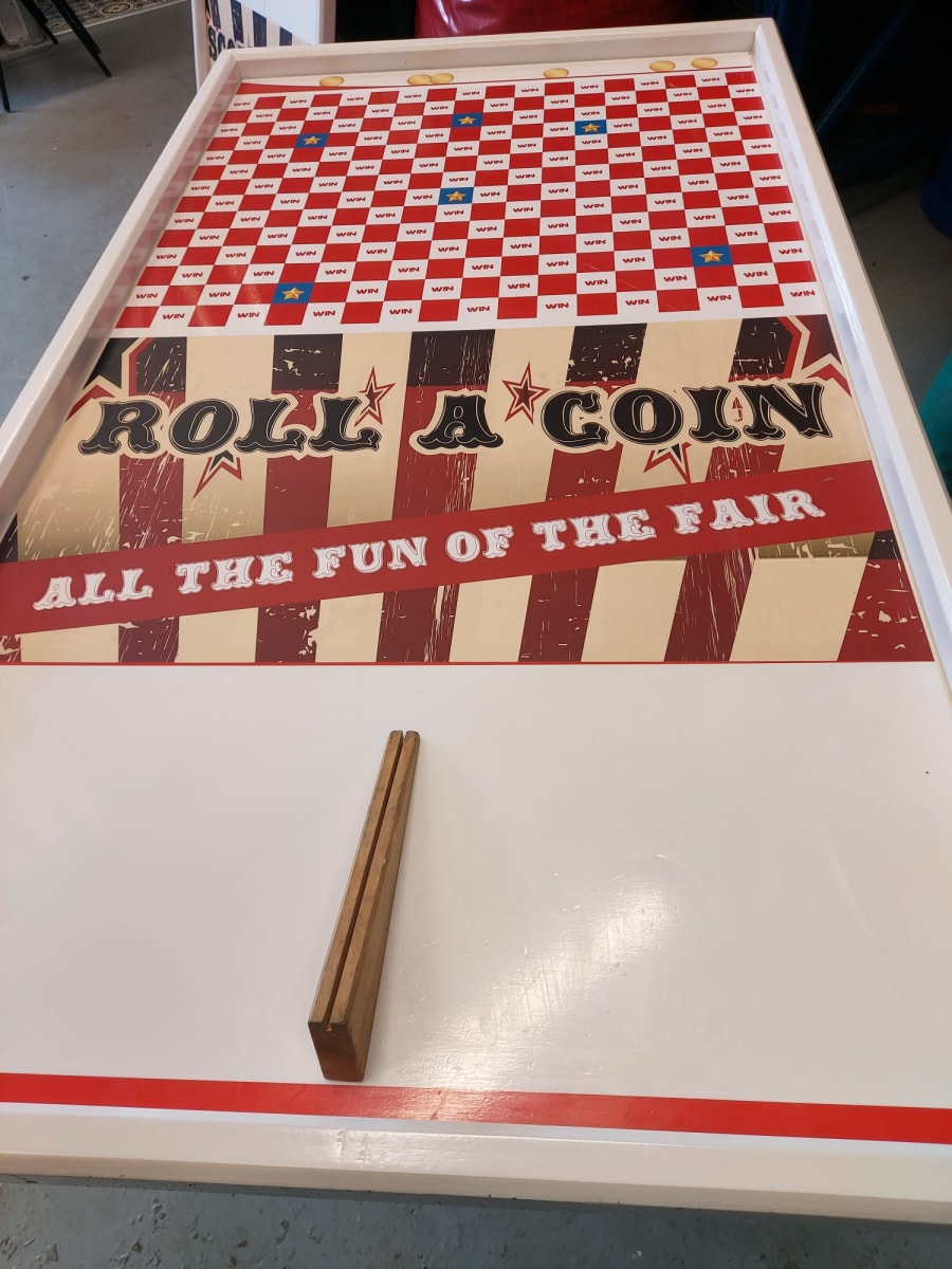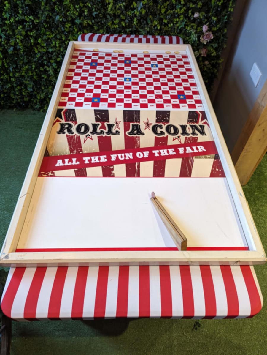 You will need to provide a table to place the game on. Participants can roll their own coins (great for fundraising as you can keep the coins!) or you could charge a set fee per go and keep a box of 10p coins ready for rolling.