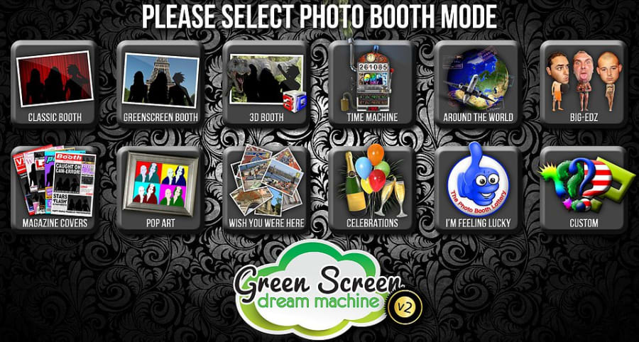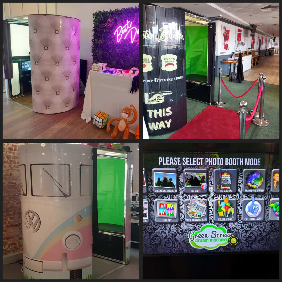 The Green screen dream machine features selectable print layout allowing the user to choose how their 6"x4" photos are printed, choose from classic double strips, 4 large photos, 1 large 4 small or our new photo mosaic layout. Users can also choose between colour, black and white, or vintage sepia photos. Don't worry if you think there's too much choice as there's a 'Lottery' option where the booth will choose for you!