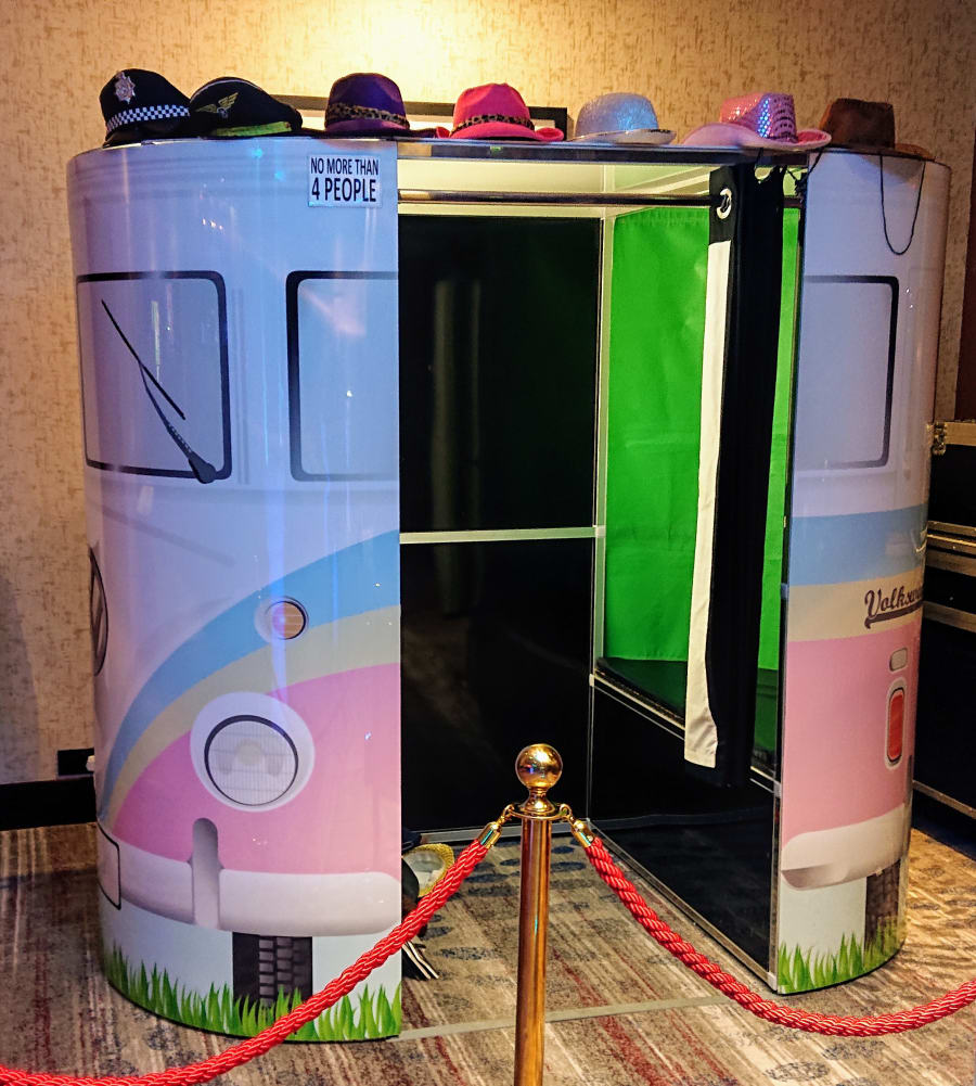 - Choice of Gloss Black (photo booth design), White Chesterfield, retro VW Camper, or Vegas design photo booth bodies