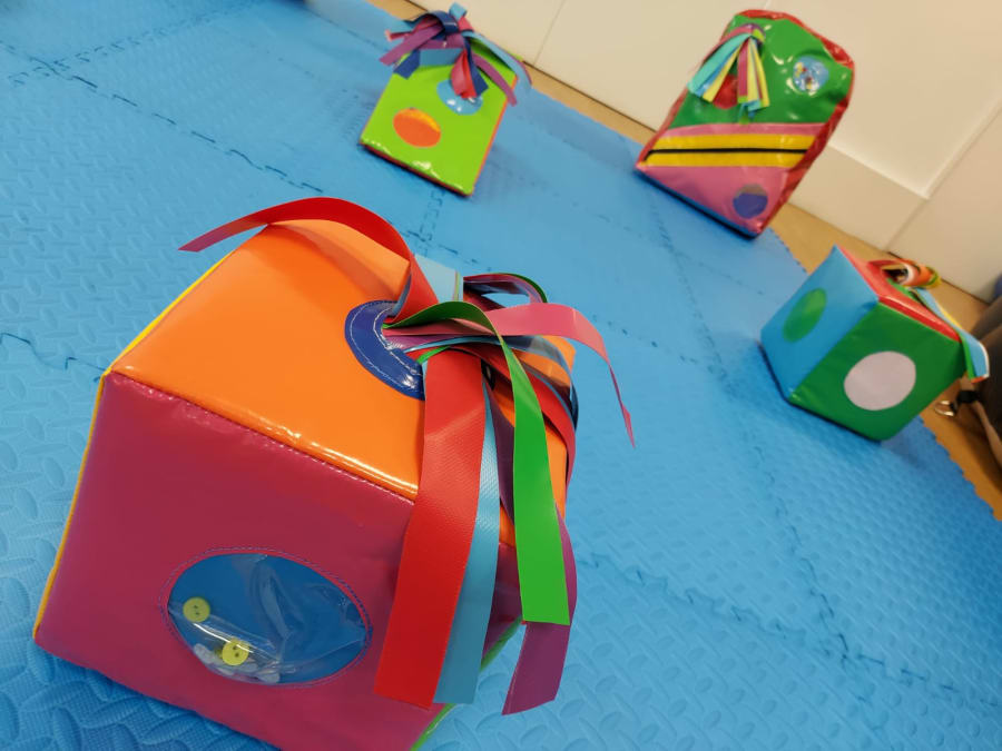 Made of soft foam covered in bright, colourful wipe clean surfaces these shapes have a multitude of tactile surfaces to explore. zips, squeaker, mesh, buttons, bells. Our soft play is set up on safety matting too.