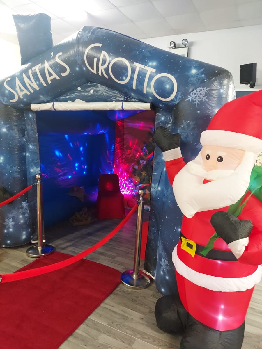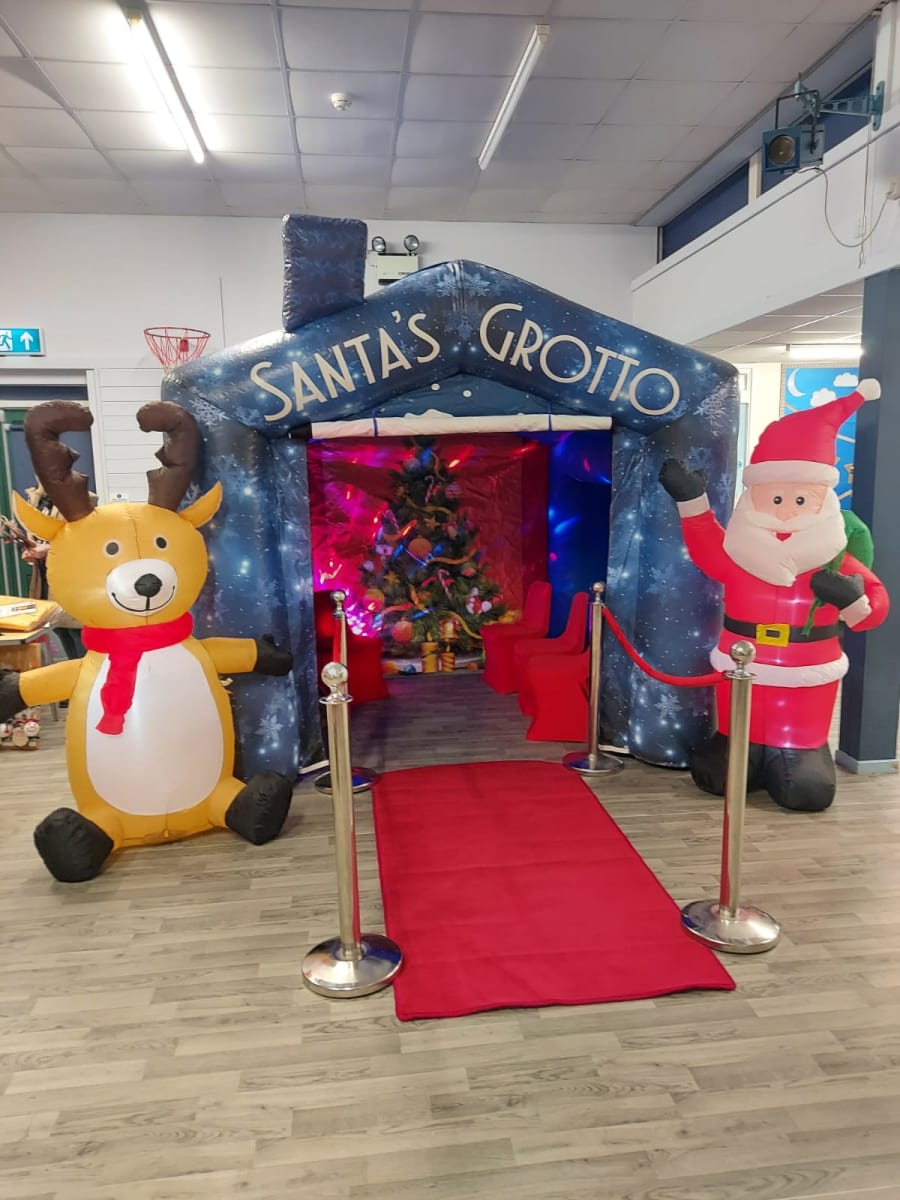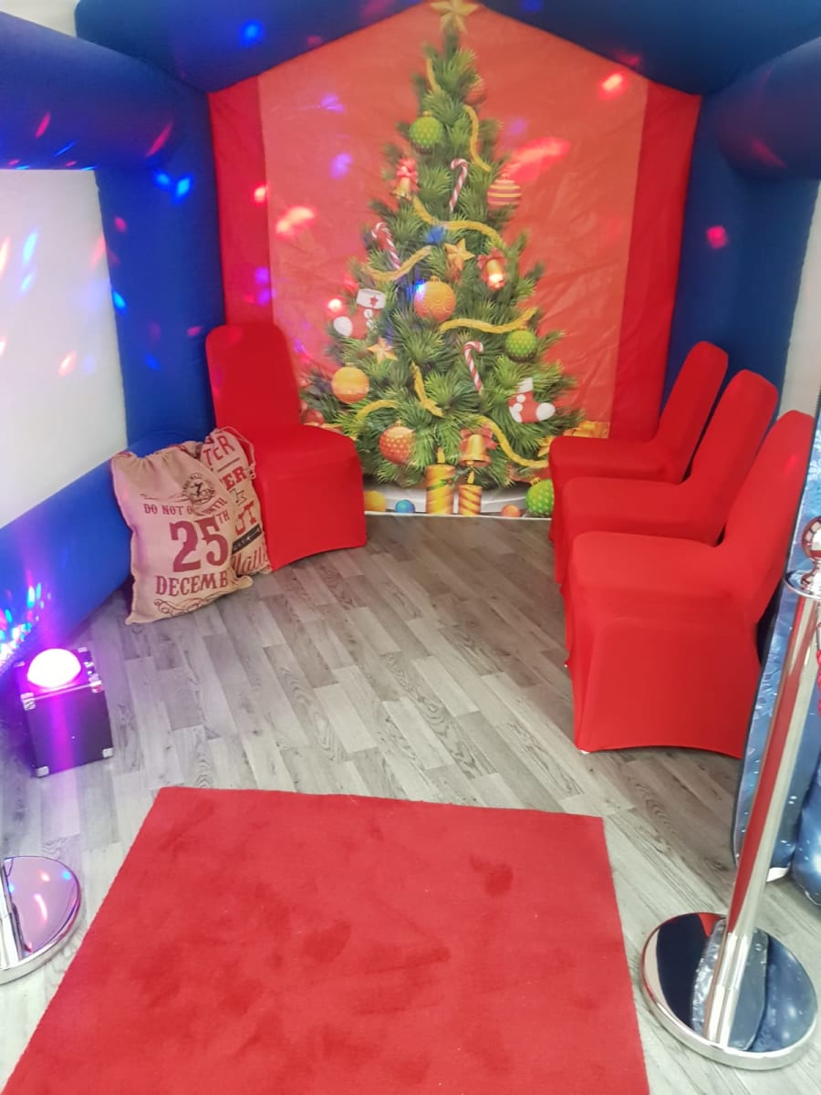 The grotto comes kitted out with seating (We provide 4 red festive seat covers to fit most chairs), Santa sacks, red carpet with que ropes and also a speaker with lights. This year our grotto also comes with 2 6ft inflatable characters, Santa and his reindeer of course!