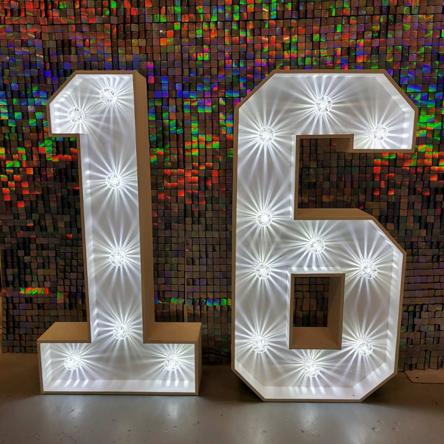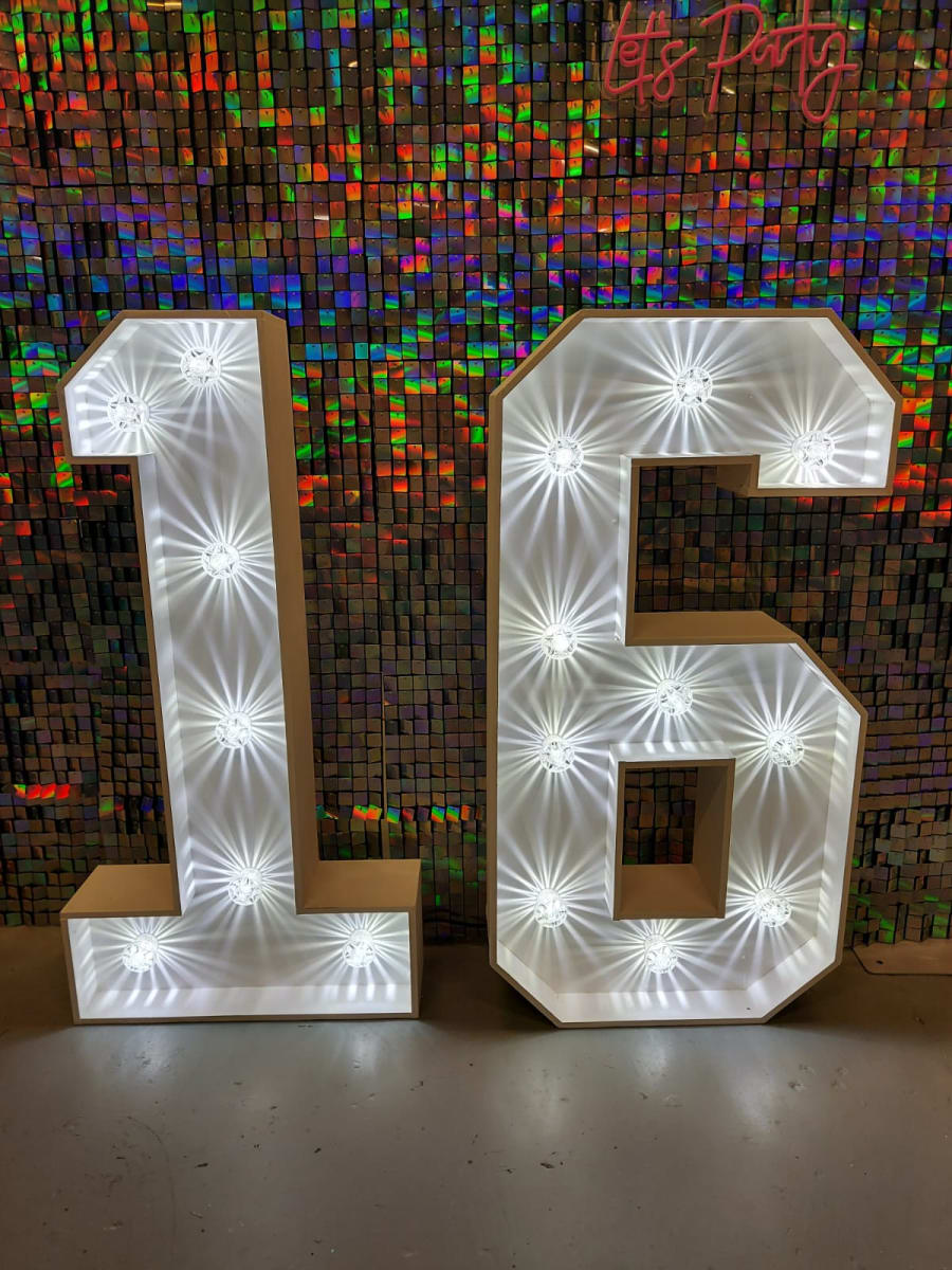 Are you looking for something to bring an extra sparkle to your party? Looking to take amazing photographs? Our 4ft LED Numbers & Letters are perfect for all occasions. Our number 16 is great for a mile stone birthday. Have them as a statement piece by an entrance or as a backdrop for your photos, our numbers look great anywhere!