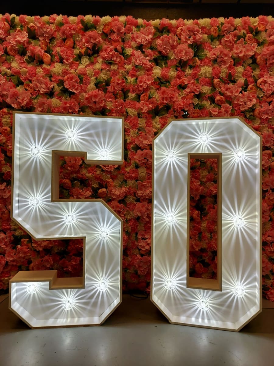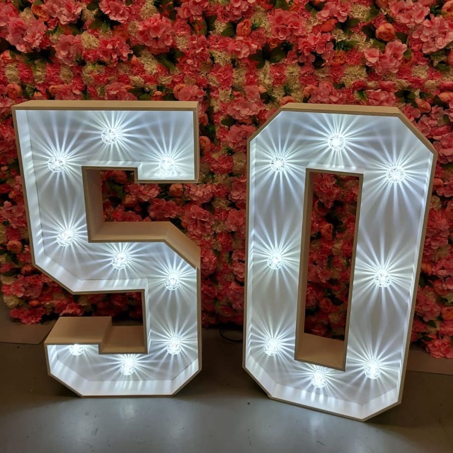 Are you looking for something to bring an extra sparkle to your party? Looking to take amazing photographs? Our 4ft LED Numbers & Letters are perfect for all occasions. Our number 50 is great for a mile stone birthday. Have them as a statement piece by an entrance or as a backdrop for your photos, our numbers look great anywhere!