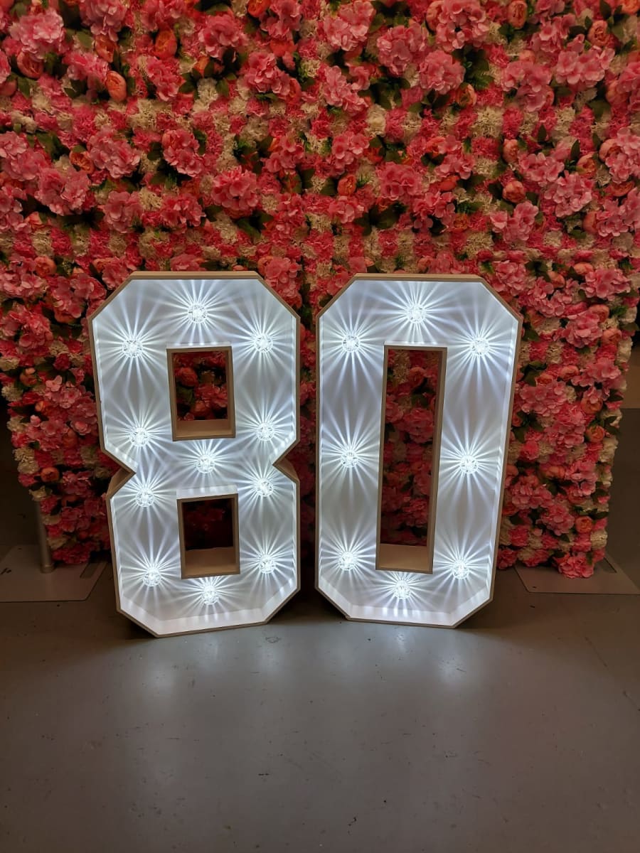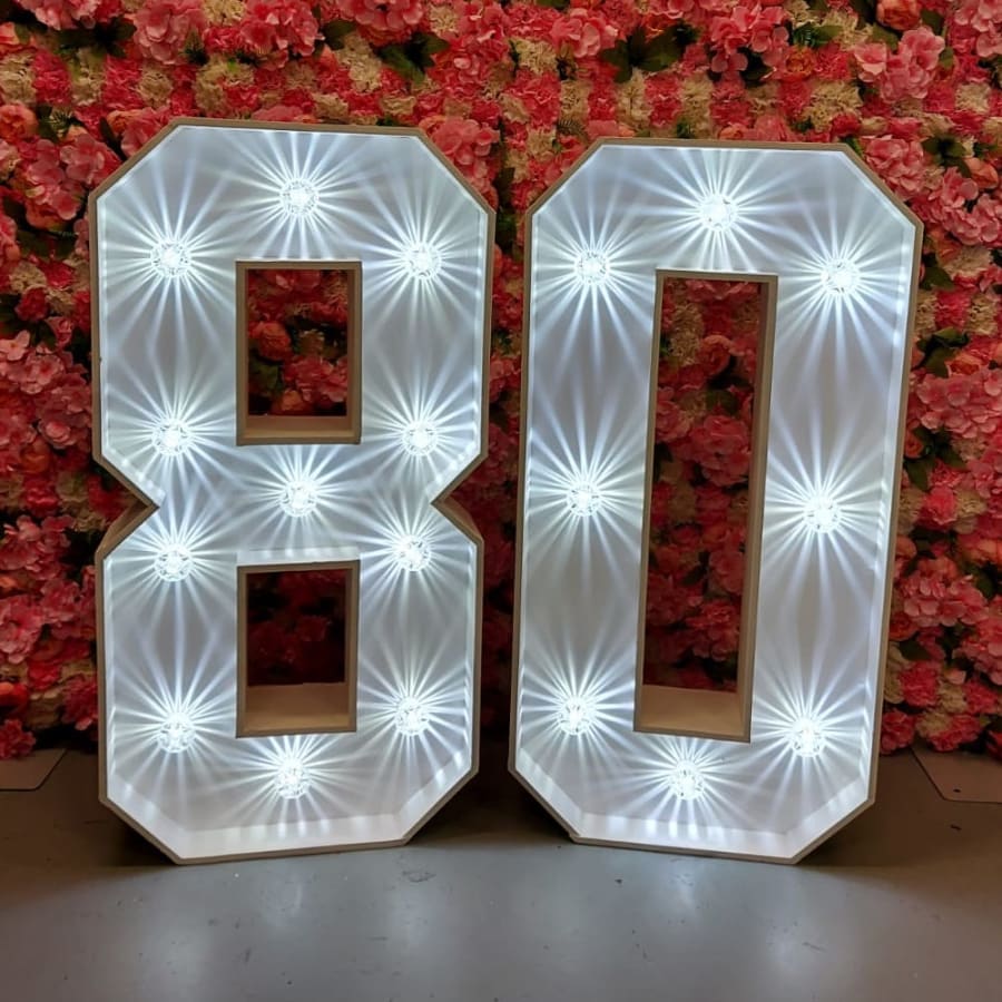 Are you looking for something to bring an extra sparkle to your party? Looking to take amazing photographs? Our 4ft LED Numbers & Letters are perfect for all occasions. Our number 80 is great for a mile stone birthday. Have them as a statement piece by an entrance or as a backdrop for your photos, our numbers look great anywhere!